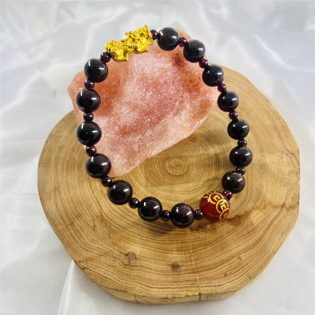 「辟邪貔貅 紅石榴手珠」具有光明、善行、清靜、富貴、幸福、長壽豐饒、吉祥如意、消災解厄、逢凶化吉之意。每一串「辟邪貔貅 紅石榴手珠」皆由紅石榴穿製而成,並搭配沙金材質的立體貔貅一只,貔貅除了辟邪涵義還有招財之意,和紅石榴相得益彰,磁場十分祥和、保證讓您愛不釋手,更能增顯您修佛的歡喜心、珍貴非凡。